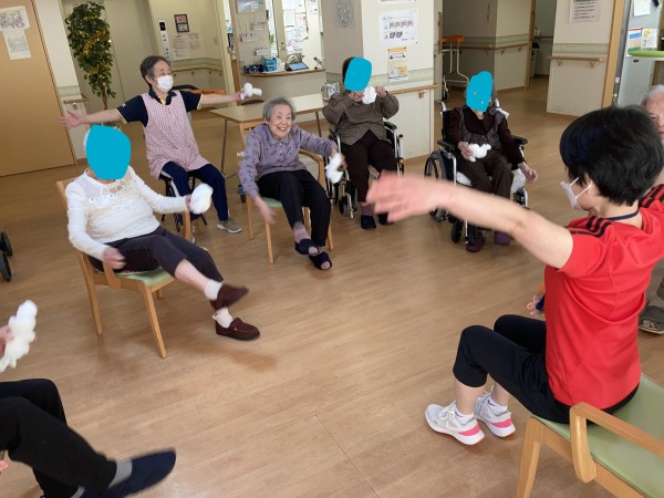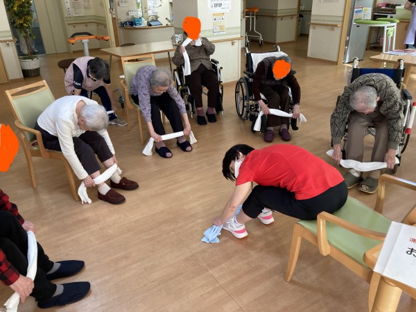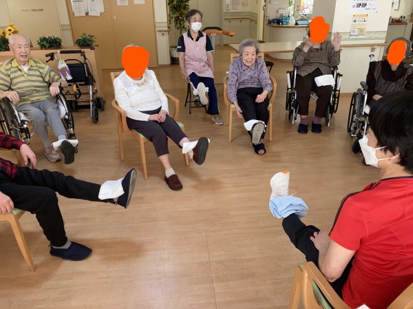 皆さん、タオルを持って、手を上げたり、足を上げたりと