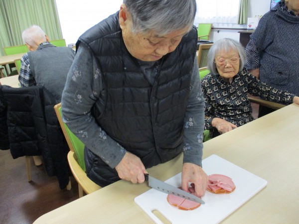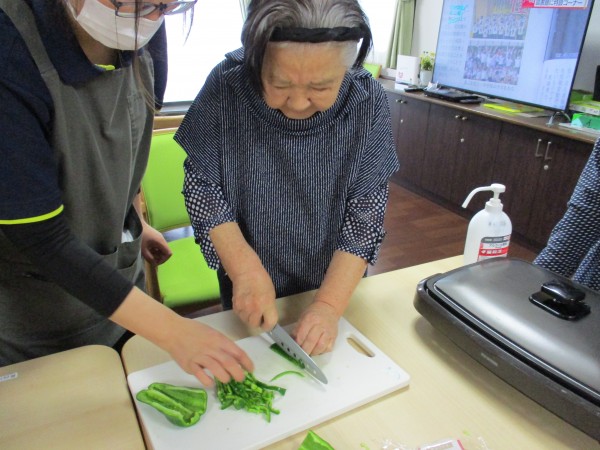 ピーマン・玉ねぎ・ハムを皆さん順番に切ってもらいました。