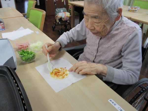 今日のメニューはぎょうざの皮を生地にみたてたピザです。
