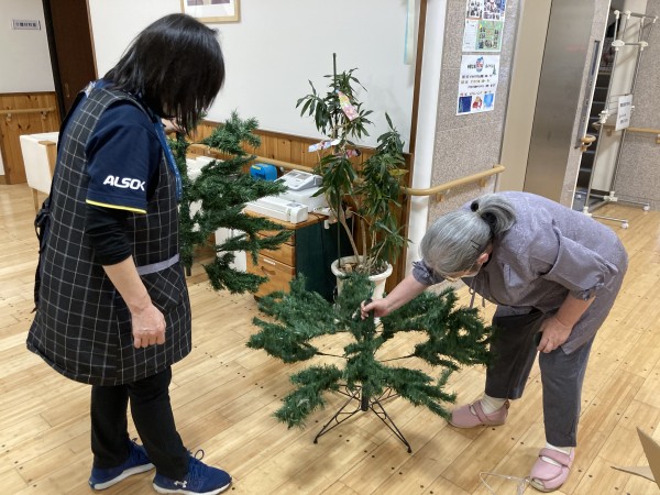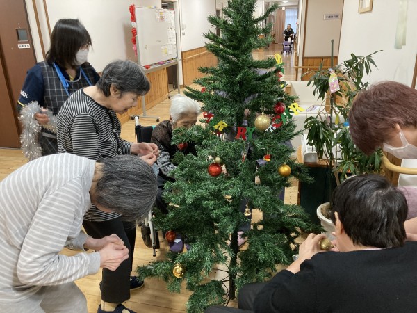 先日、入居者様にクリスマスツリーの飾り付けをしていただきました。