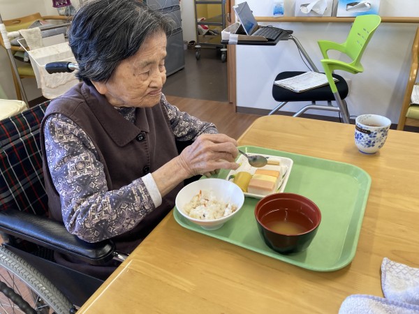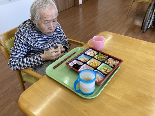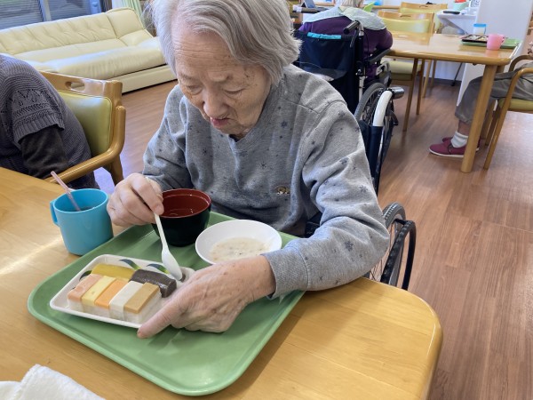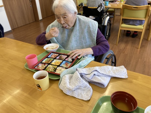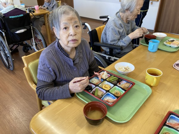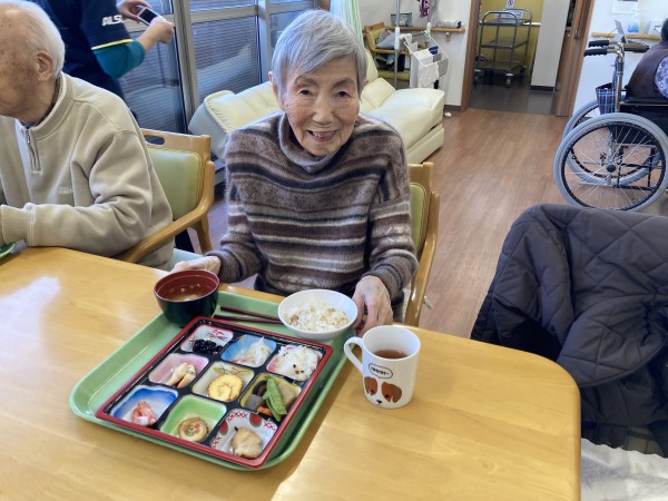 こんにちは!グループホームみんなの家・あきがせの介護ブログです。よろしくお願いいたします。2階の1月元旦、おせち料理の召し上がられているご様子です///