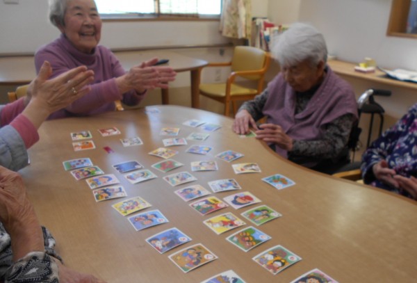 丸くなって和気あいあいとカルタ取りをする利用者様~