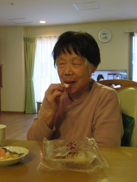 ご家族からのプレゼントをお渡しすると「うれしいわ~、何かしら?」・・・中にはなんと大好物の干し芋と素敵なタオルケットが入っていました!干し芋はさっそくおやつに。「これなつかしいわ、おいしわぁ~」と満面の笑顔。素敵なお誕生日になりました。
