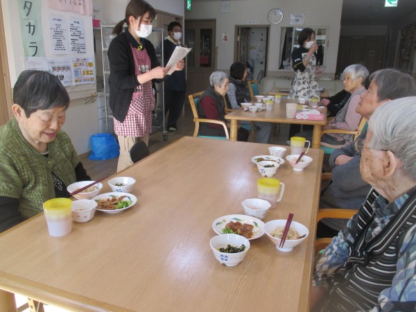 食前体操の後に配膳、献立紹介、皆様揃って「いただきます」が毎日の様子です。
