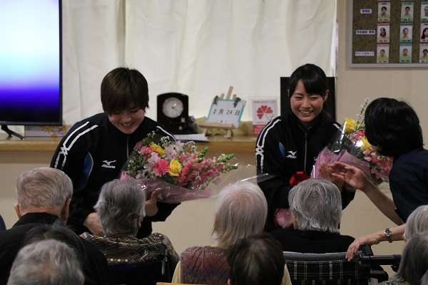 ご利用者様を代表して、100歳の渡辺様と99歳の福井様が、お二人にお花を贈ってくださいました。選手のお二人は、皆様と一緒に