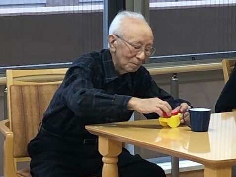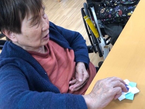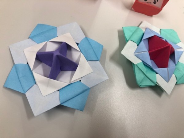 次は折り紙3枚で作ったコマまわし!上手に回せるかな?