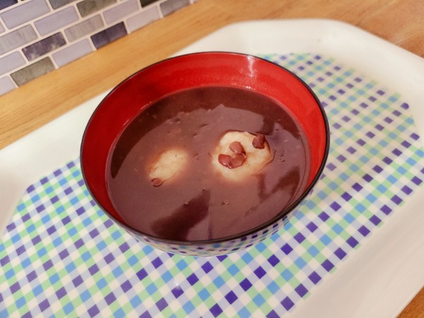 ホーム長が作ったお汁粉にお団子を入れたら完成で~す!