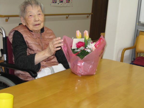 こんにちは!グループホームみんなの家・あきがせの介護ブログです。よろしくお願いいたします。1/16のお誕生日にお花のプレゼントを郵送してきてくださいました。びっくりされていましたが喜ばれていました????
