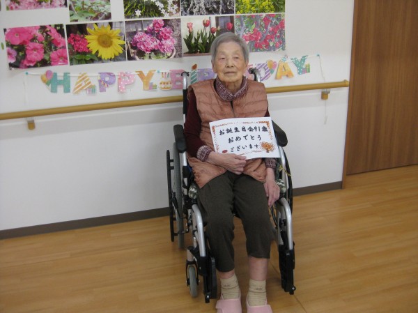 1/13 93歳になりました。お誕生日おめでとうございます! 健康で楽しく過ごしていきたいと話されていました。職員一同、安全にお過ごしいただけるようにサポートしていきたいと思います。
