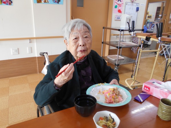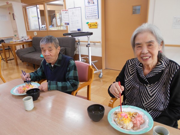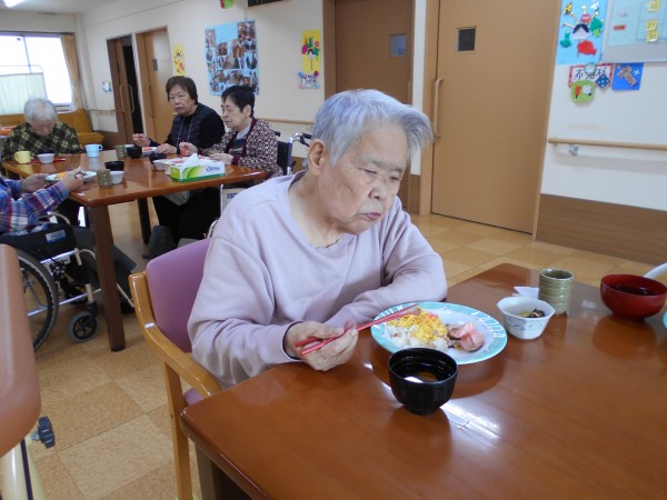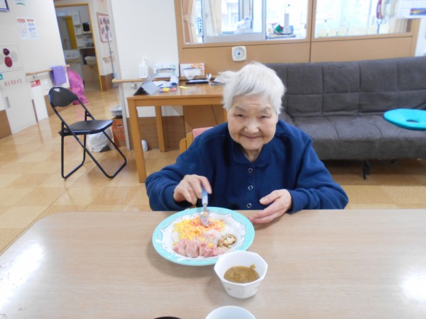スタッフ手作りのちらし寿司、可愛い焼売と肉巻きを各フロアで召し上がりました。