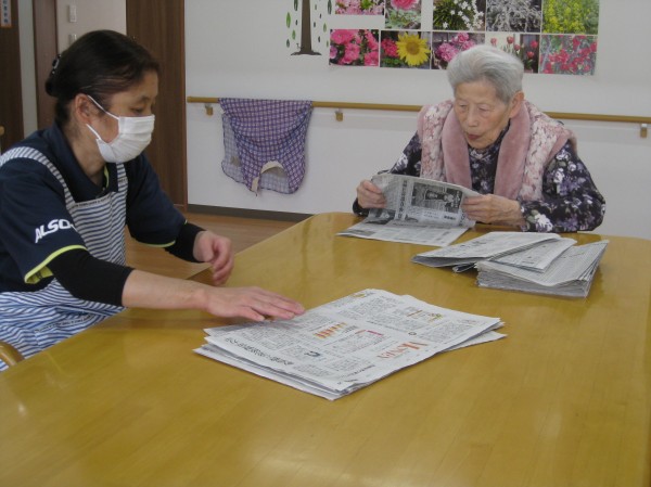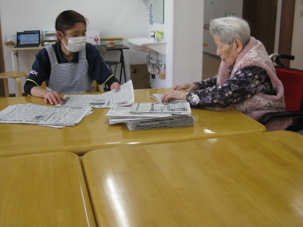 今日は職員と一緒に新聞を畳んでいます。これいいのよね、手の運動にもなるしね(笑)と丁寧に畳んでおられました( ^ω^)・・・ おしゃべりしながら楽しそうですね!!