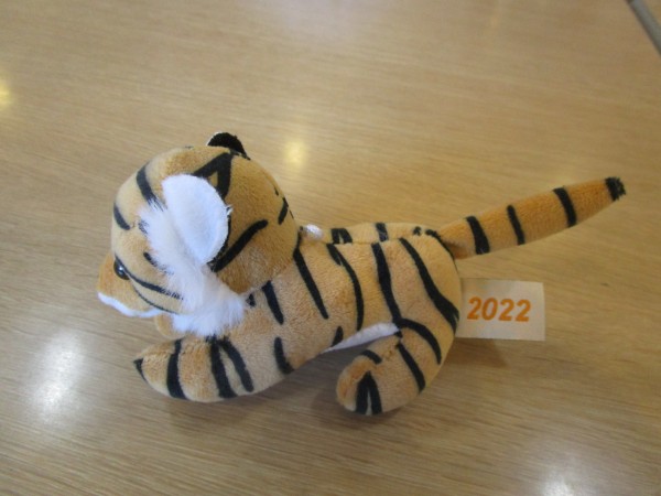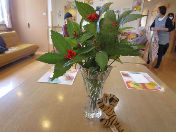 千両のお花、お茶とお菓子を乗せるランチョンマットを用意し、今年の干支の寅のぬいぐるみもいます!