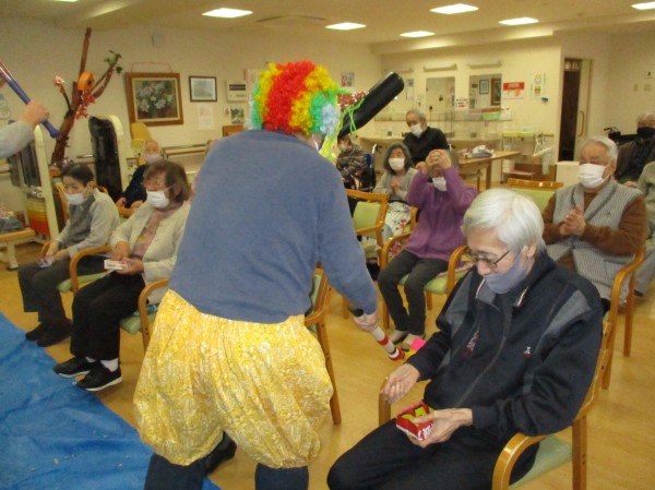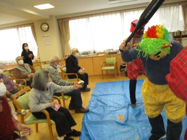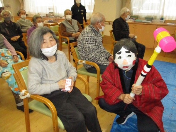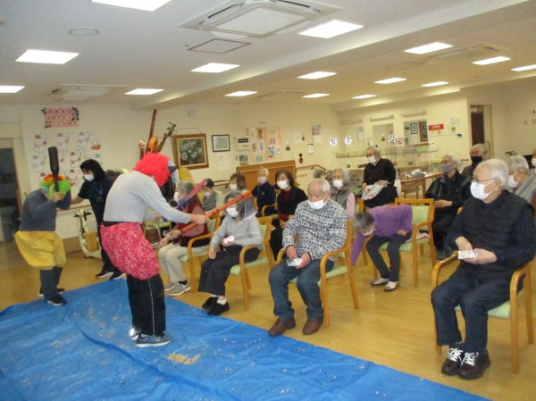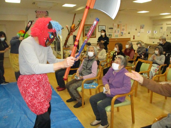 こんにちは!デイサービスセンター遊 西東京です! 今日のレクレーションは豆まきです!鬼が棒や斧を持って動きまわっています。