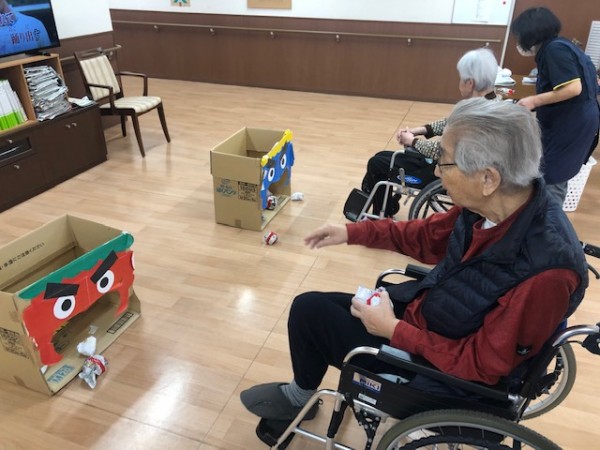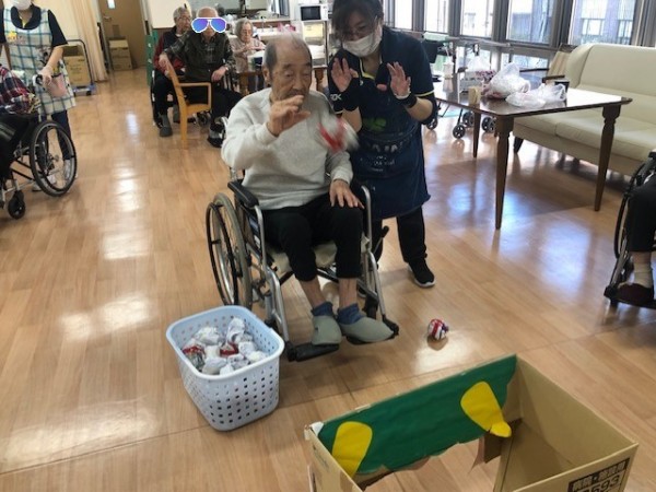 豆まきの後は箱に豆を投げ入れるレク開始♪