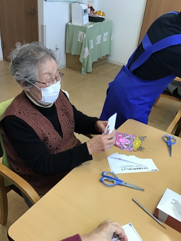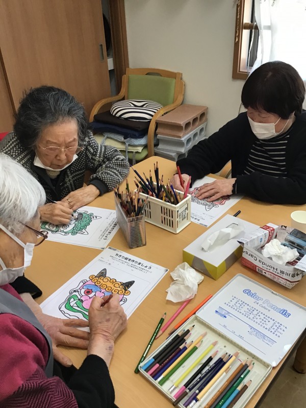 節分当日は午後から行うレクで使う鬼のお面を
