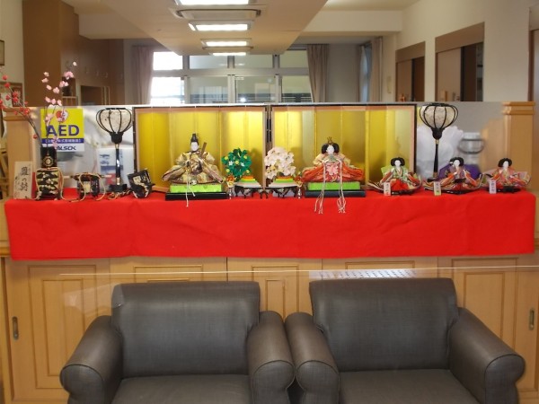 華やかな雛飾りに、施設内が明るくなりました。