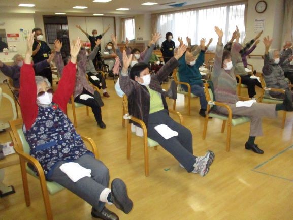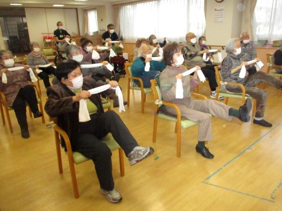 今日の運動レクレーションは『zoomタオル体操です!』皆さん一生懸命タオルを動かす中で自然と体操されていました。