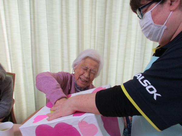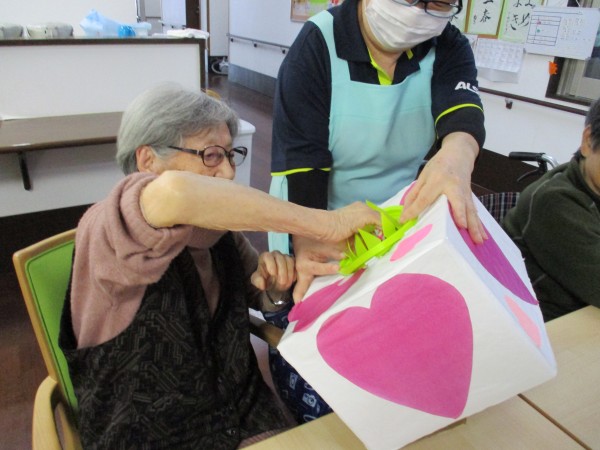 2月14日はバレンタイン企画という事で午後のお茶の時間に【お菓子のつかみ取り】を行いました(^^♪