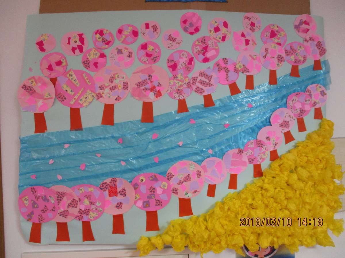 河津桜をイメージした貼り絵が出来上がりました(*^。^*)
