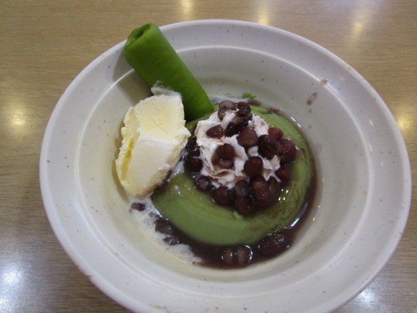 抹茶プリンにホイップクリーム、皆様の大好きなあんこをかけ、アイスを添えて出来上がり♪