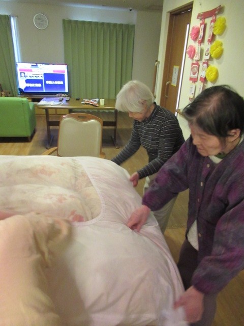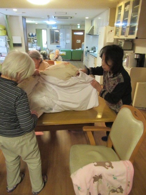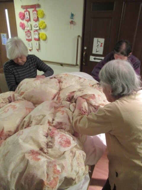 本日は皆さんで協力して掛布団カバーをつけた時の様子です(^^)/