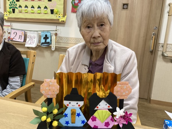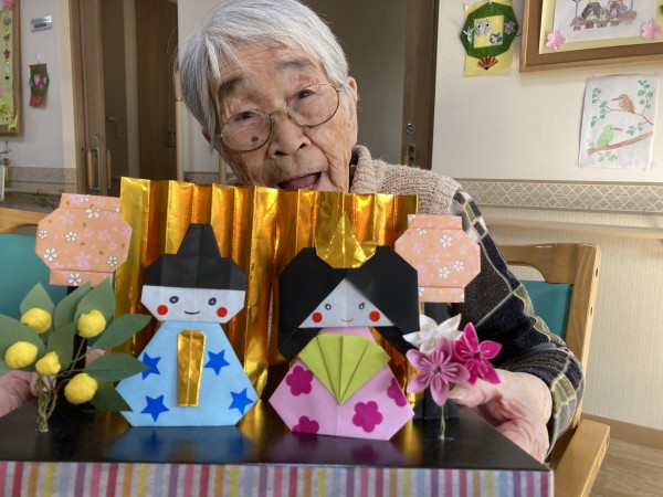 職員とご入居者様手作りのお雛様と一緒に写真を撮りました。