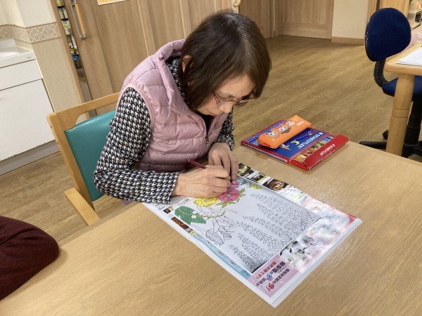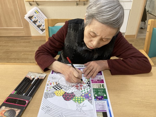 ご入居者様は、お好きな歌を一緒に歌われたり、塗り絵に集中されていたり、読書をされたりと思い思いに過ごされています。
