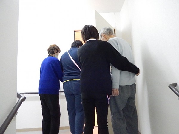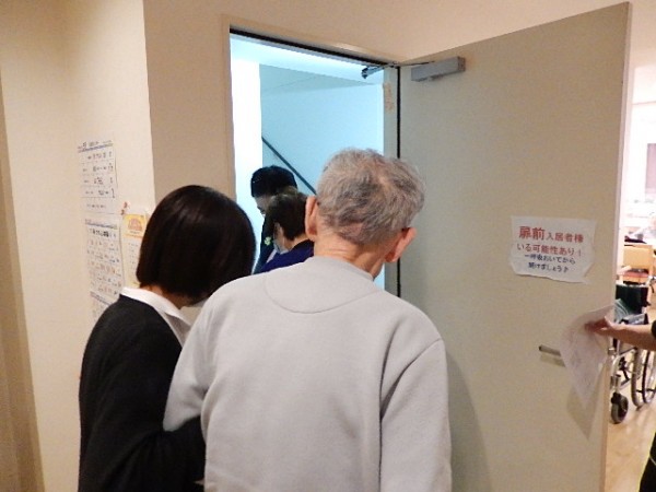 ご利用者さまにも上階への避難誘導にご協力していただき、頑張って階段を登ってくれましたぁ(;^_^A