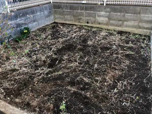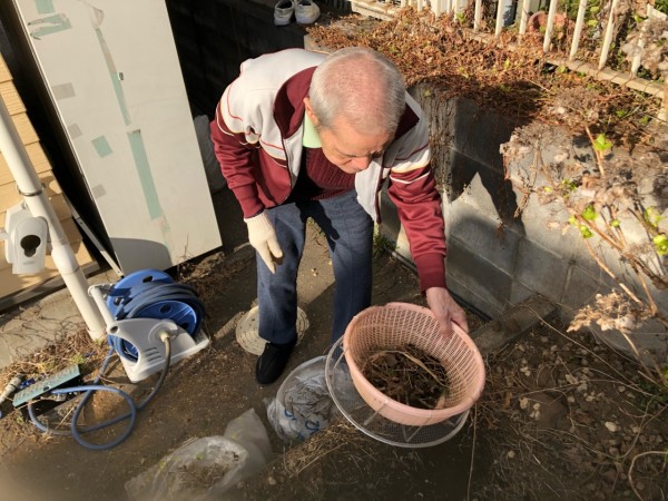 土ふるいがなかったので即席土ふるいをざるで手作りしました。
