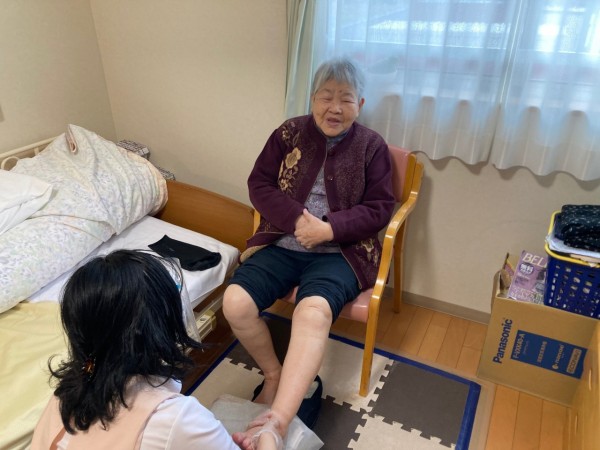 皆様居室で椅子に座りセラピストと楽しくお話ししながら足をもみほぐしてもらっています。