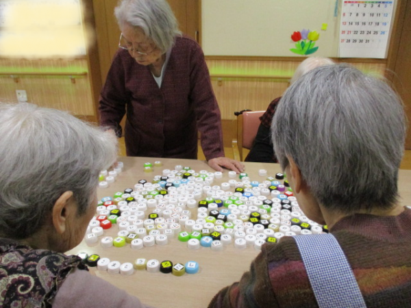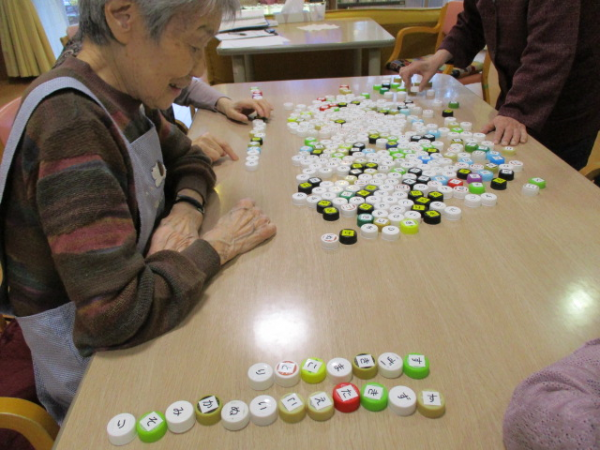 ・ペットボトルのキャップにひらがな50音(濁音等も全部ですが、、、)のシールを貼り、スタッフがお題を発表!!