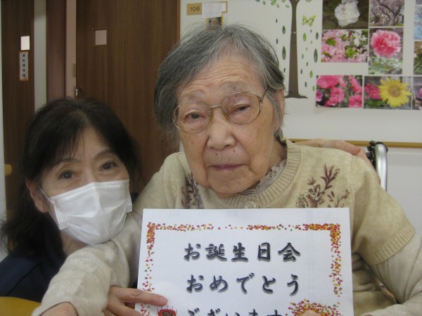 お誕生日おめでとうございます。いつまでもお元気にお過ごしください!(^^)! 笑顔で写真撮影!! 誕生日の歌を合唱しケーキを召し上がりお祝いをしました( ^ω^)・・・