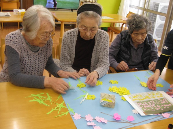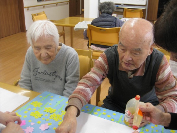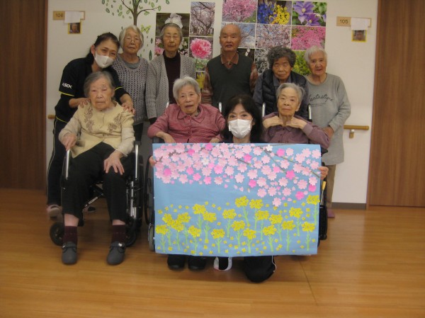 こんにちは!グループホームみんなの家・あきがせの介護ブログです!よろしくお願いいたします。中々お外にいけないので菜の花と桜の貼りを行いました( ^ω^)・・・ みんなで楽しく貼ることができました!!