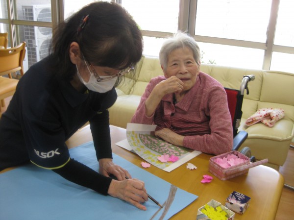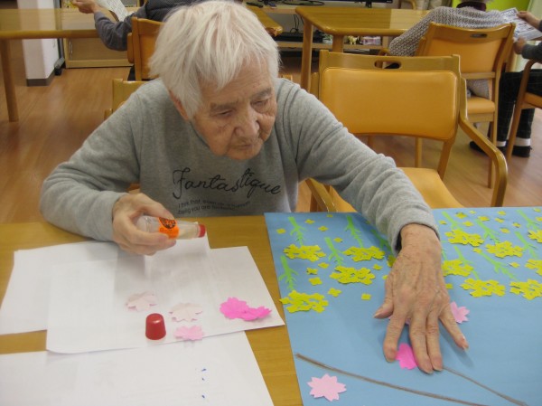 菜の花を貼っています。桜の枝を書いています。 ここに貼った方がいいんじゃない??と和気あいあいと楽しまれていました( ^ω^)・・・