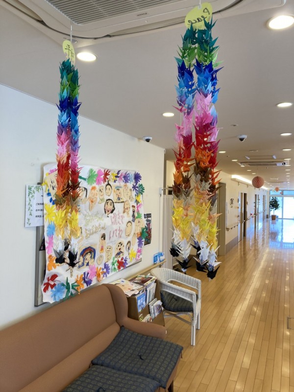 当施設1Fのフロアに折り鶴が飾り付けされています。