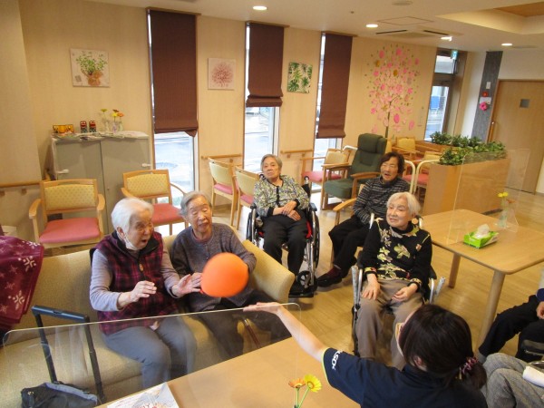 本日、新しくご入居されたご利用者さまを早速お誘いし、みんなで“風船バレー”を行いましたぁ(^_-)-☆