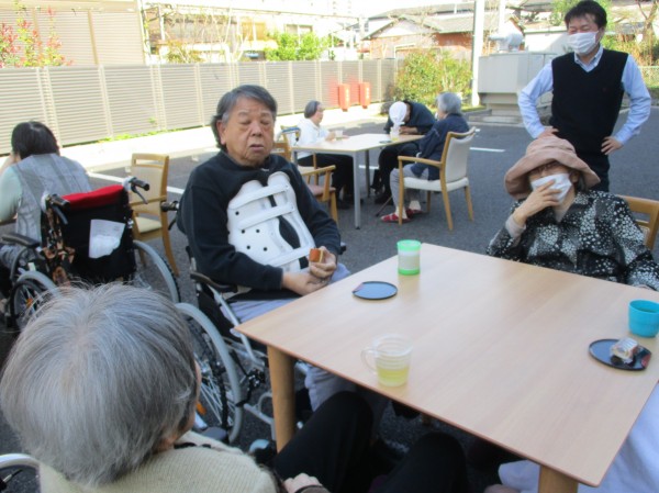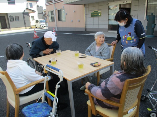 4月6日、前日まで寒い日が続いていましたが、急に暖かくなったので、おやつを外で召し上がっていただきました。