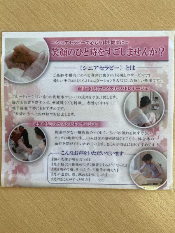 ご利用者様の毎日を『いきいき』とお過ごしいただく為に考案されたオリジナルの癒しのサービスです。