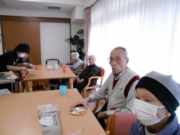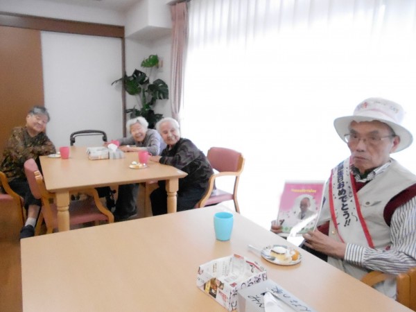 誕生日帽子(?)とタスキを掛け 2階の入居者様に祝っていただきました