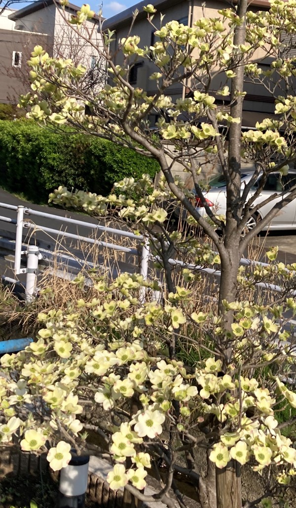 白色やピンクが多い中、中野島のホームのハナミズキは黄色の綺麗なお花です♪
