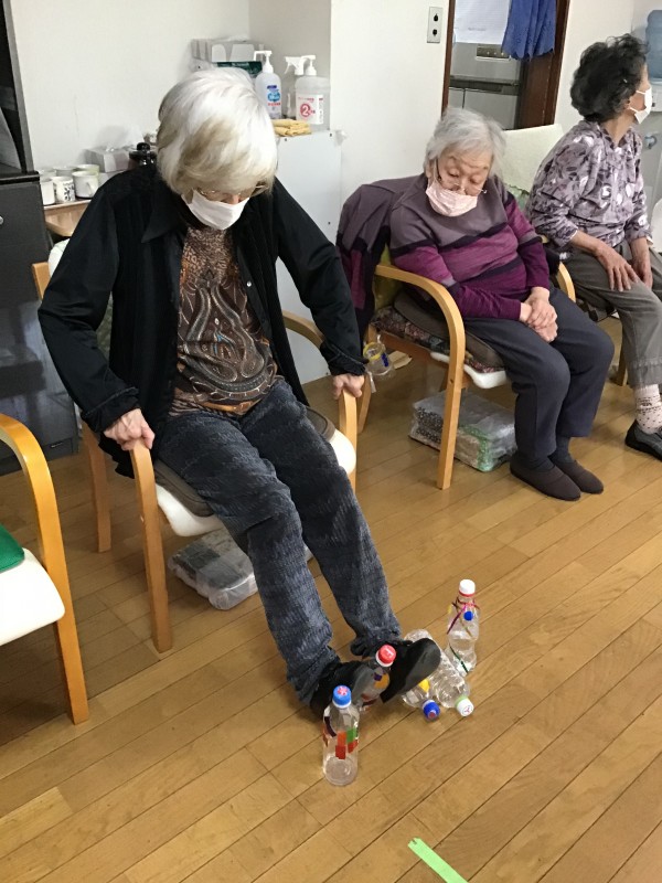 足で行う「ペットボトル立てゲーム」など