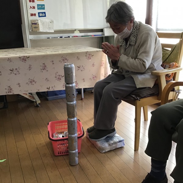 床から高く積み上げる「空き缶積みゲーム」