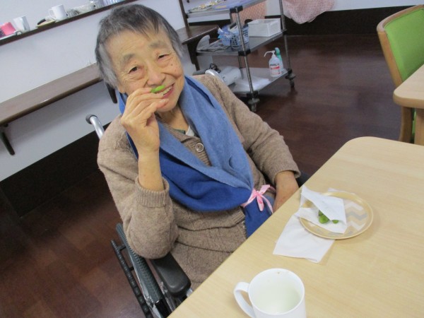 本日のおやつは居酒屋風のおやつとして、枝豆・ポテトチップス・ポッキーにしました。