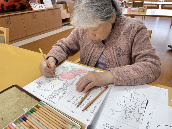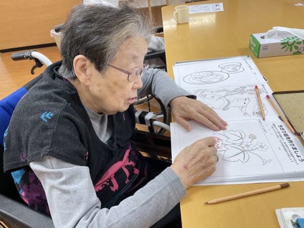塗り絵をしながら思い出話をしたり、細かい部分は無言でまさに全集中で取り組まれています。