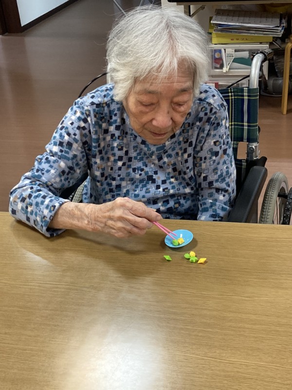 小さな箸のようなもので小さな物を挟んで移動させるゲームで手を細かく動かすことができ