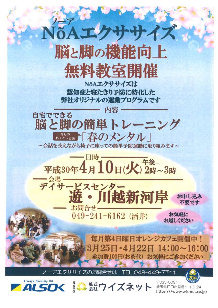 4月10日(火)14:00~15:00デイサービスセンター 遊・川越新河岸の施設内でNO-Aエクササイズが行われます!!