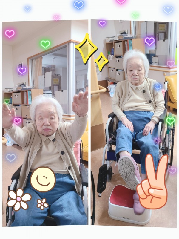 次に椅子に座ったまま背筋を伸ばして足踏みをしたり、足を上げたまま数を数えたり、と足の運動をしました。少し集中力が切れ始めてしまった方もいらっしゃいましたが、頑張ってついていっておりました。職員も時々一緒に参加しましたが、まぁ疲れますね(;´∀`)