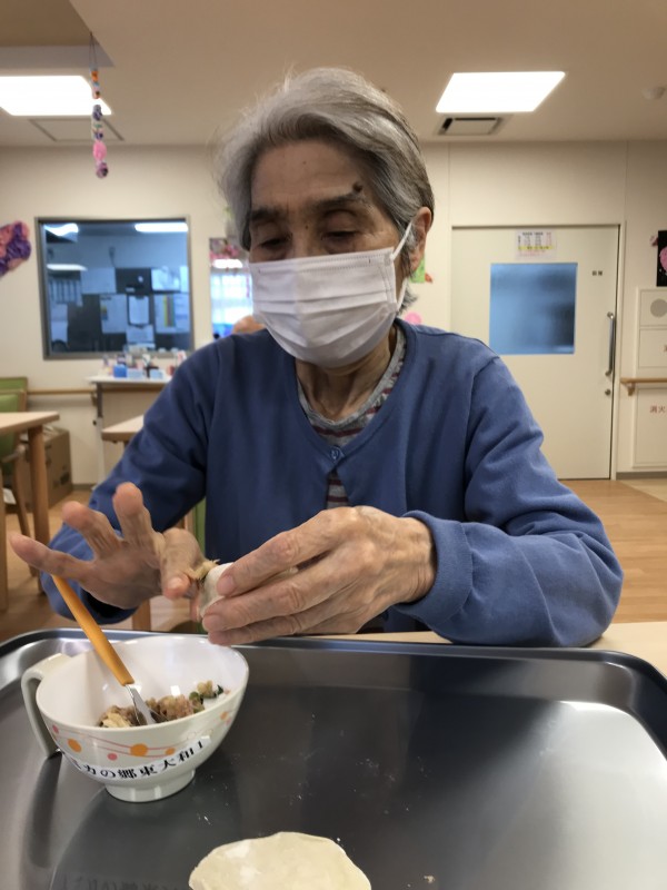当施設の中国出身のスタッフに本場中国の餃子の作り方を教えてもらいながら作りました♪