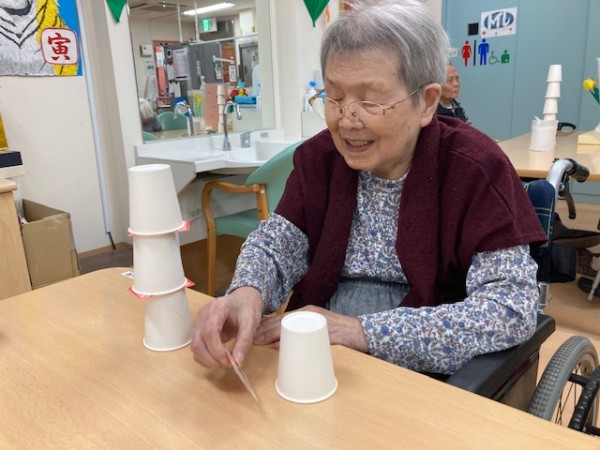 グループホームみんなの家・墨田で紙コップを使い何段詰めるか挑戦しました。