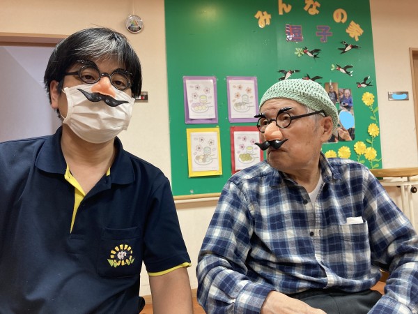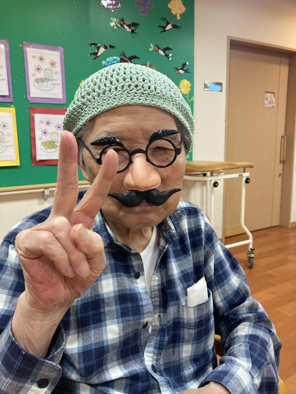 職員が持ってきた鼻眼鏡をかけているところを